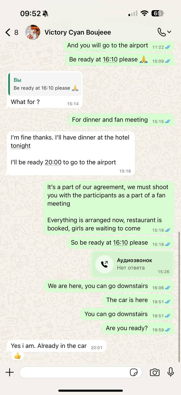 There are also screenshots of messages showing Cyan ignoring multiple requests. The managers consistently scheduled specific filming slots at the end of each day — during dinner or just before escorting the bloggers to their hotels — and reminded them each morning.
