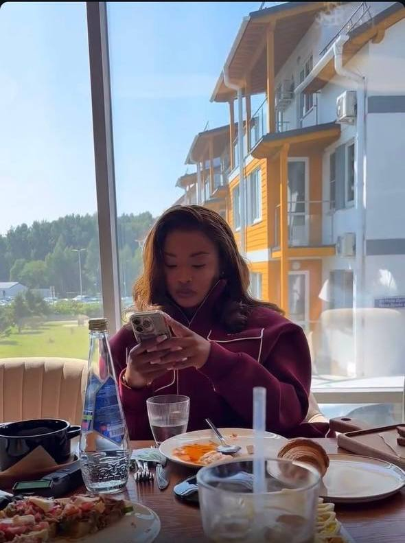Food is another central accusation. Boujee claimed that both participants and she herself were barely fed. But is that really true? Photos from Alabuga in our possession show “starving” Cyan seated at a dining table, scrolling through her phone. And on the table? “Practically nothing” — except for half-eaten salads, croissants, cheese platters, beverages, and various other food items.