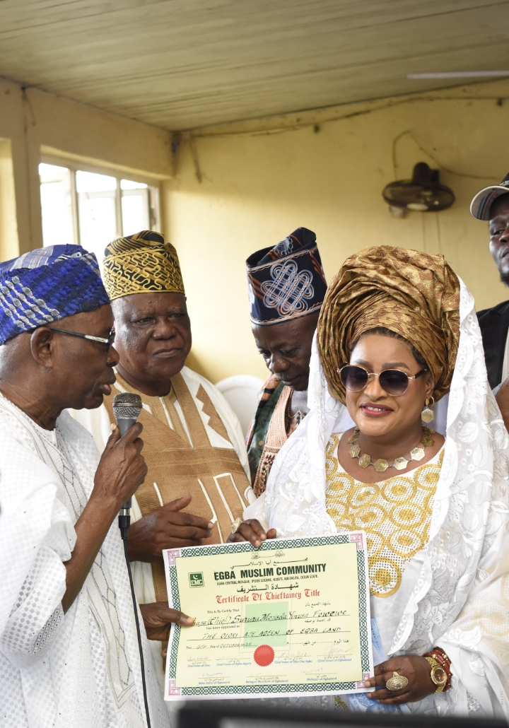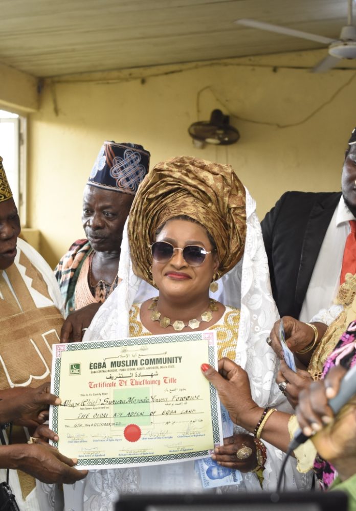 She also thanked the Chief Imam of Egbaland and the entire Muslim Ummah for finding her worthy of the dual honours, pledging to use her new positions to further promote Islamic values, unity, and the empowerment of Muslim women across Egbaland.
