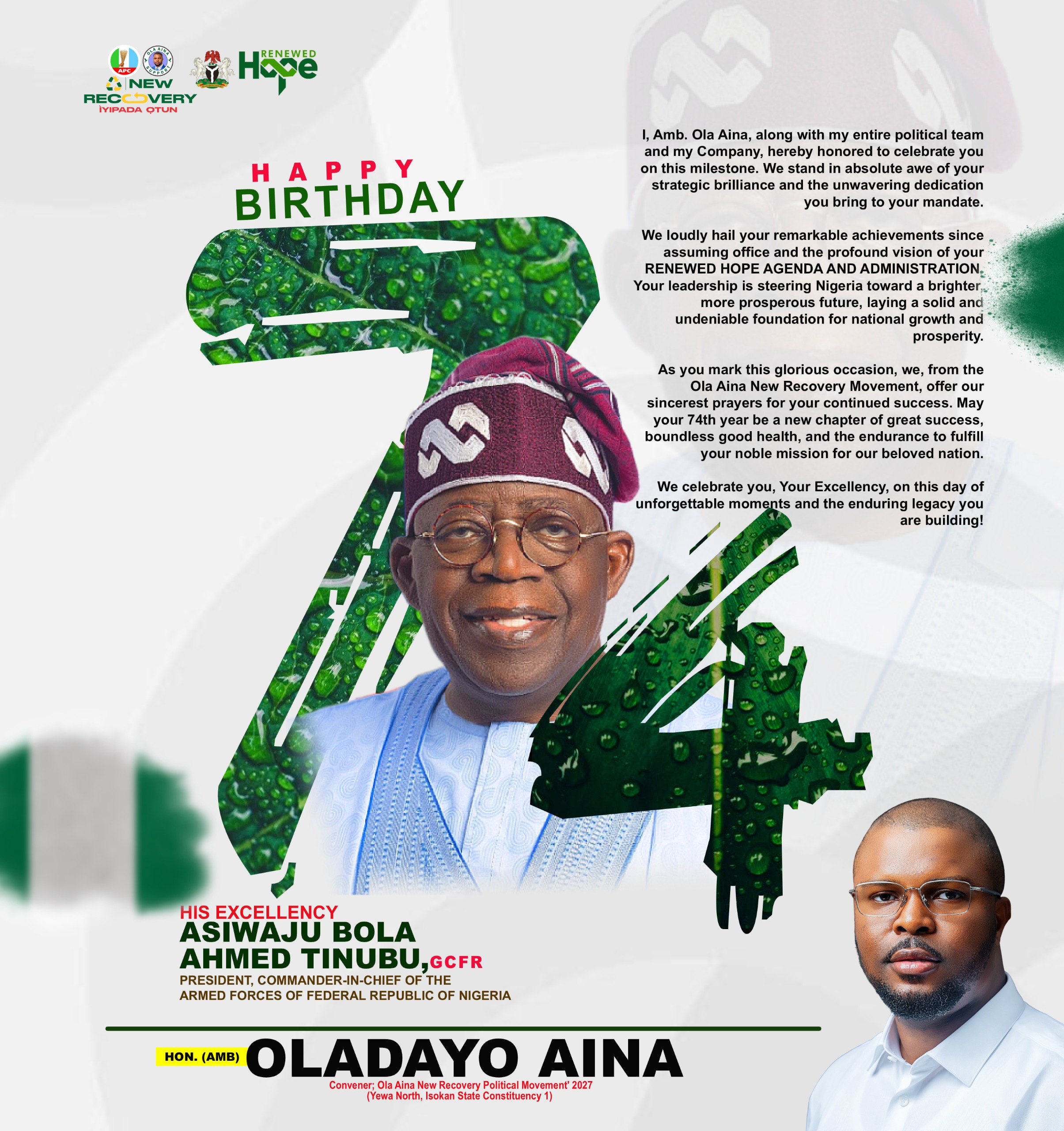 Tinubu at 74: Ogun Aspirant Oladayo Aina Hails President’s Leadership